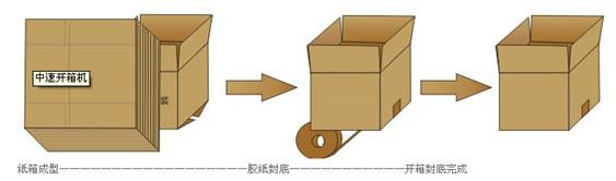 開箱機是指自動完成開箱、成形、下底折葉折曲。并現(xiàn)時完成下部分膠帶粘貼,將疊成紙板的箱板打開,箱子底部按一定程序折合,并用膠帶密封后輸送給裝箱機的專用設(shè)備。自動紙箱成型機、自動開箱機是大批量紙箱自動開箱、自動折合下蓋、自動密封下底膠帶的流水線設(shè)備,機器全部采用PLC+顯示屏控制,大大方便操作,是自動化規(guī)模生產(chǎn)必不可少的設(shè)備。